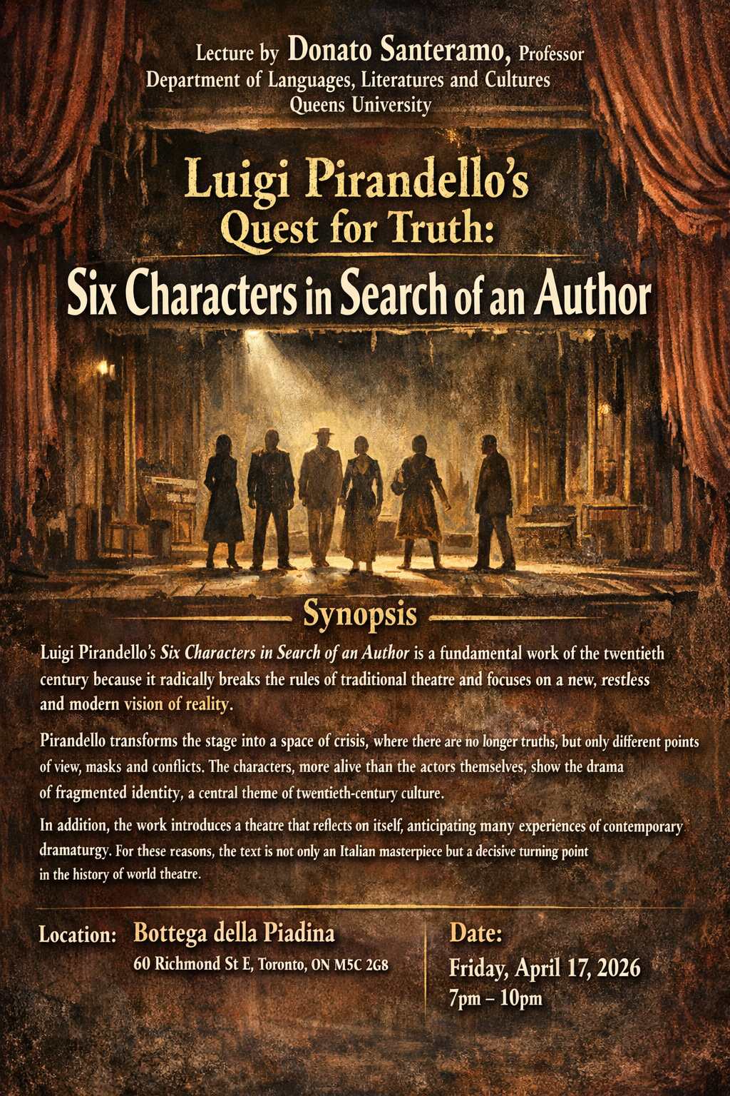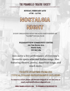 The history of mankind is the history of ideas. – LUIGI PIRANDELLO ON SALE NOW PURCHASE TICKETS PAST WORK Here are some of our amazing past performances VIEW MORE ABOUT Inspiring Canadian culture with Italian culture through drama READ MORE